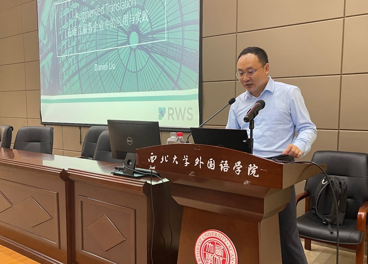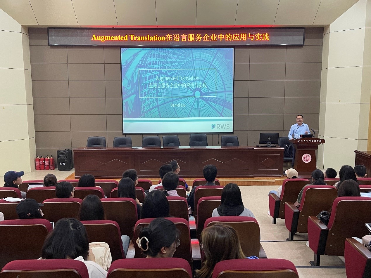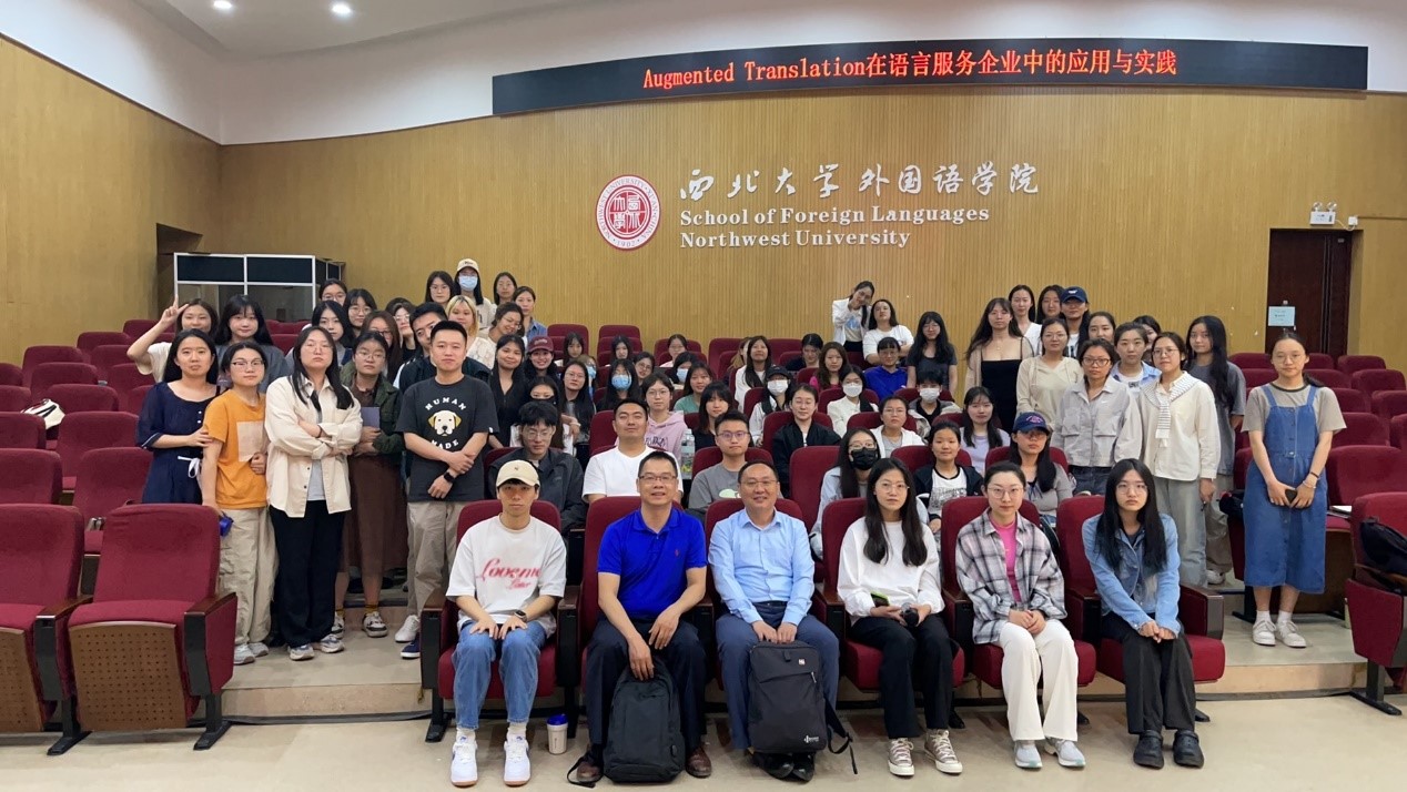 On the afternoon of April 25, Liu Yang, Technical Manager of Beijing Ruwensi Technology Information Consulting Co. Ltd., a wholly-owned subsidiary of the RWS Group, and an external mentor for the Master's in Translation program at the School of Foreign Languages, Northwest University, visited our school to deliver a lecture titled "The Application and Practice of Augmented Translation in Language Service Enterprises." The lecture was hosted by Associate Professor Chen Hanliang, and all 2023 cohort Master's students in Translation attended the session.