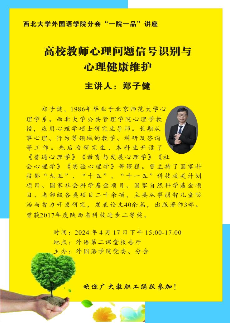 To support the mental health of our faculty and staff and enhance their resilience to stress, our school organized a lecture on April 17, 2024, in the Second Classroom Auditorium. The lecture, titled “Identifying Psychological Issues and Maintaining Mental Health for University Teachers”, was delivered by Professor Zheng Zijian, a psychology professor at the School of Public Administration, Northwest University, and a graduate advisor for applied psychology students. More than 20 faculty and staff members attended the event.