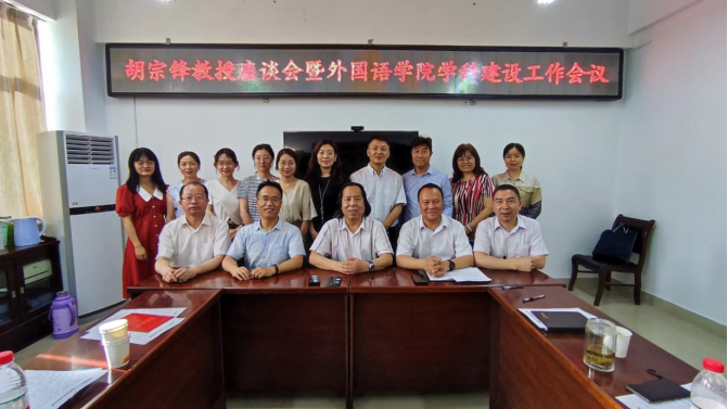 讲座结束后,胡宗锋教授还与外国语学院的部分老师进行了座谈。座谈会由宝鸡文理学院外国语学院 副院长史传龙教授主持,学院院长李伟教授、副院长冯琳副教授、学校西北工合研究中心首席研究员张占勤、王卫强教授、大外部主任张雨、翻译系主任鱼为全和翻译系全体教师参加了此次座谈会。